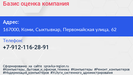 Базис оценка, компания по адресу 167000, Коми, Сыктывкар, Первомайская улица, 62 в дальнейшем Организация, размещена в следующих категориях: