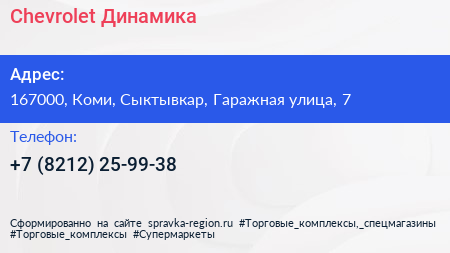 Chevrolet Динамика по адресу 167000, Коми, Сыктывкар, Гаражная улица, 7 в дальнейшем Организация, размещена в следующих категориях: