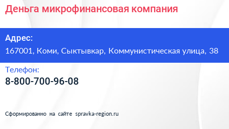 Деньга, микрофинансовая компания по адресу 167001, Коми, Сыктывкар, Коммунистическая улица, 38 в дальнейшем Организация, размещена в следующих категориях: