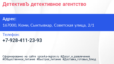 ДетективЪ, детективное агентство по адресу 167000, Коми, Сыктывкар, Советская улица, 2/1 в дальнейшем Организация, размещена в следующих категориях:
