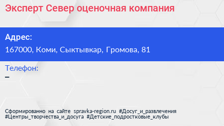 Эксперт-Север, оценочная компания по адресу 167000, Коми, Сыктывкар, Громова, 81 в дальнейшем Организация, размещена в следующих категориях: