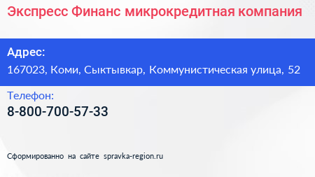 Экспресс Финанс, микрокредитная компания по адресу 167023, Коми, Сыктывкар, Коммунистическая улица, 52 в дальнейшем Организация, размещена в следующих категориях: