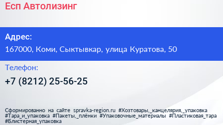 Есп Автолизинг по адресу 167000, Коми, Сыктывкар, улица Куратова, 50 в дальнейшем Организация, размещена в следующих категориях: