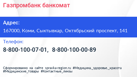 Газпромбанк, банкомат по адресу 167000, Коми, Сыктывкар, Октябрьский проспект, 141 в дальнейшем Организация, размещена в следующих категориях: