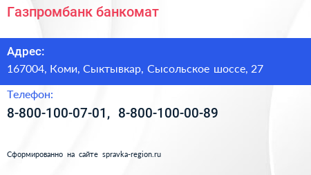 Газпромбанк, банкомат по адресу 167004, Коми, Сыктывкар, Сысольское шоссе, 27 в дальнейшем Организация, размещена в следующих категориях: