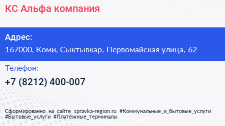 КС Альфа, компания по адресу 167000, Коми, Сыктывкар, Первомайская улица, 62 в дальнейшем Организация, размещена в следующих категориях: