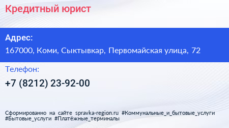 Кредитный юрист по адресу 167000, Коми, Сыктывкар, Первомайская улица, 72 в дальнейшем Организация, размещена в следующих категориях: