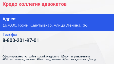 Кредо, коллегия адвокатов по адресу 167000, Коми, Сыктывкар, улица Ленина, 36 в дальнейшем Организация, размещена в следующих категориях:
