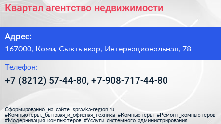 Квартал, агентство недвижимости по адресу 167000, Коми, Сыктывкар, Интернациональная, 78 в дальнейшем Организация, размещена в следующих категориях: