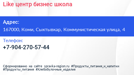 Like центр, бизнес-школа по адресу 167000, Коми, Сыктывкар, Коммунистическая улица, 4 в дальнейшем Организация, размещена в следующих категориях: