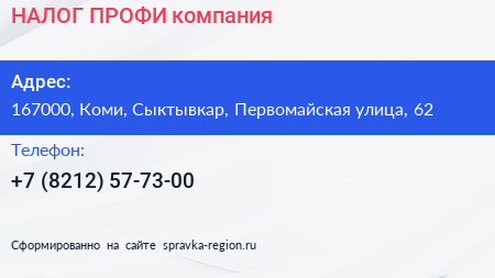 НАЛОГ-ПРОФИ, компания по адресу 167000, Коми, Сыктывкар, Первомайская улица, 62 в дальнейшем Организация, размещена в следующих категориях: