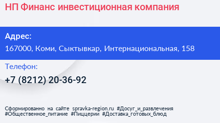 НП-Финанс, инвестиционная компания по адресу 167000, Коми, Сыктывкар, Интернациональная, 158 в дальнейшем Организация, размещена в следующих категориях: