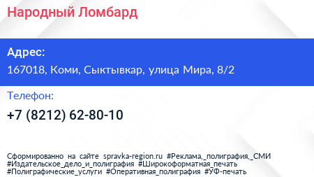 Народный Ломбард по адресу 167018, Коми, Сыктывкар, улица Мира, 8/2 в дальнейшем Организация, размещена в следующих категориях: