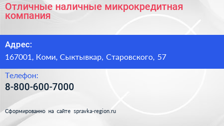 Отличные наличные, микрокредитная компания по адресу 167001, Коми, Сыктывкар, Старовского, 57 в дальнейшем Организация, размещена в следующих категориях: