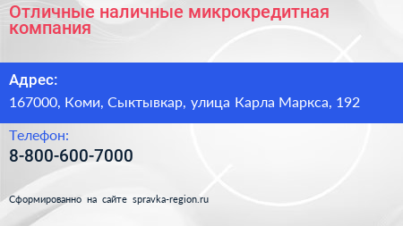 Отличные наличные, микрокредитная компания по адресу 167000, Коми, Сыктывкар, улица Карла Маркса, 192 в дальнейшем Организация, размещена в следующих категориях: