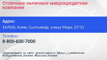 Отличные наличные, микрокредитная компания по адресу 167026, Коми, Сыктывкар, улица Мира, 27/11 в дальнейшем Организация, размещена в следующих категориях: