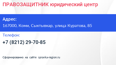ПРАВОЗАЩИТНИК, юридический центр по адресу 167000, Коми, Сыктывкар, улица Куратова, 85 в дальнейшем Организация, размещена в следующих категориях: