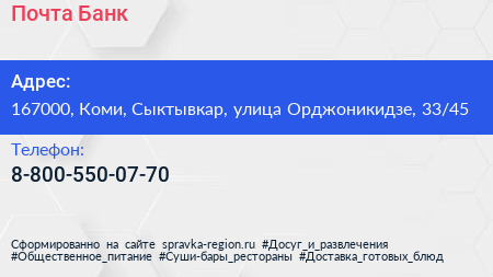Почта Банк по адресу 167000, Коми, Сыктывкар, улица Орджоникидзе, 33/45 в дальнейшем Организация, размещена в следующих категориях: