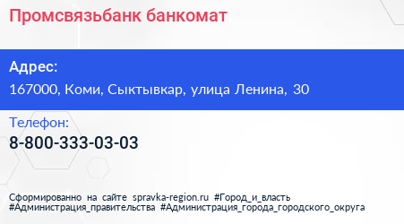 Промсвязьбанк, банкомат по адресу 167000, Коми, Сыктывкар, улица Ленина, 30 в дальнейшем Организация, размещена в следующих категориях:
