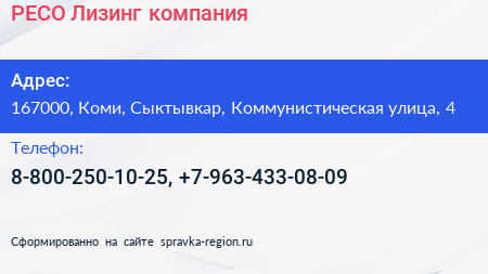 РЕСО-Лизинг, компания по адресу 167000, Коми, Сыктывкар, Коммунистическая улица, 4 в дальнейшем Организация, размещена в следующих категориях: