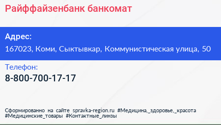 Райффайзенбанк, банкомат по адресу 167023, Коми, Сыктывкар, Коммунистическая улица, 50 в дальнейшем Организация, размещена в следующих категориях: