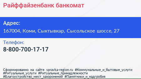 Райффайзенбанк, банкомат по адресу 167004, Коми, Сыктывкар, Сысольское шоссе, 27 в дальнейшем Организация, размещена в следующих категориях: