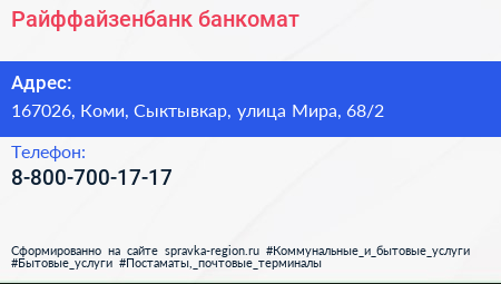 Райффайзенбанк, банкомат по адресу 167026, Коми, Сыктывкар, улица Мира, 68/2 в дальнейшем Организация, размещена в следующих категориях: