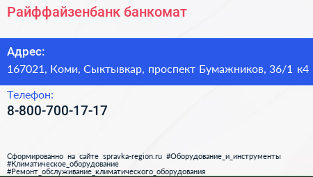 Райффайзенбанк, банкомат по адресу 167021, Коми, Сыктывкар, проспект Бумажников, 36/1 к4 в дальнейшем Организация, размещена в следующих категориях: