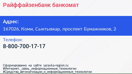 Райффайзенбанк, банкомат по адресу 167026, Коми, Сыктывкар, проспект Бумажников, 2 в дальнейшем Организация, размещена в следующих категориях: