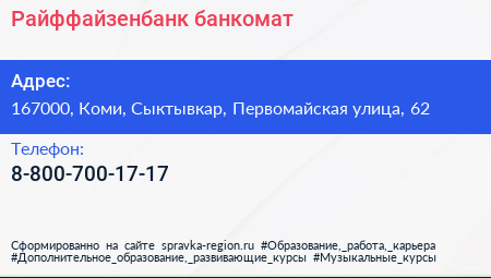 Райффайзенбанк, банкомат по адресу 167000, Коми, Сыктывкар, Первомайская улица, 62 в дальнейшем Организация, размещена в следующих категориях: