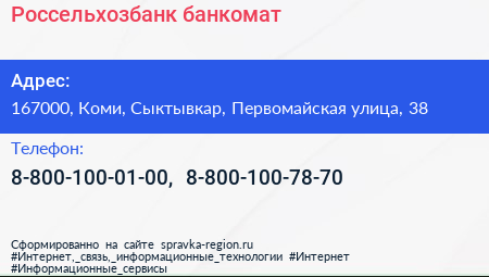 Россельхозбанк, банкомат по адресу 167000, Коми, Сыктывкар, Первомайская улица, 38 в дальнейшем Организация, размещена в следующих категориях: