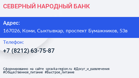 СЕВЕРНЫЙ НАРОДНЫЙ БАНК по адресу 167026, Коми, Сыктывкар, проспект Бумажников, 53в в дальнейшем Организация, размещена в следующих категориях: