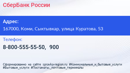 СберБанк России по адресу 167000, Коми, Сыктывкар, улица Куратова, 53 в дальнейшем Организация, размещена в следующих категориях: