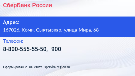 СберБанк России по адресу 167026, Коми, Сыктывкар, улица Мира, 68 в дальнейшем Организация, размещена в следующих категориях: