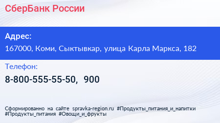 СберБанк России по адресу 167000, Коми, Сыктывкар, улица Карла Маркса, 182 в дальнейшем Организация, размещена в следующих категориях: