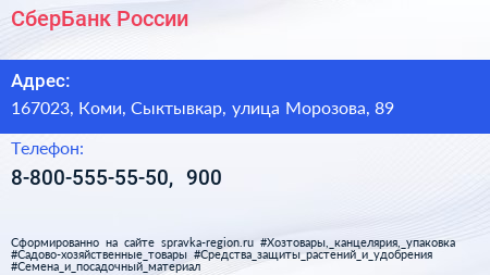 СберБанк России по адресу 167023, Коми, Сыктывкар, улица Морозова, 89 в дальнейшем Организация, размещена в следующих категориях: