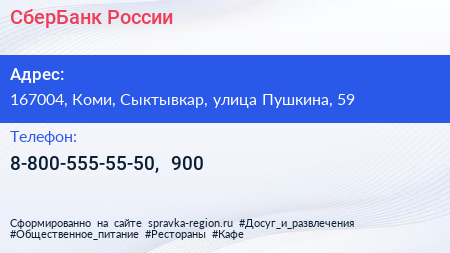 СберБанк России по адресу 167004, Коми, Сыктывкар, улица Пушкина, 59 в дальнейшем Организация, размещена в следующих категориях: