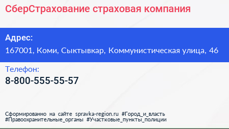 СберСтрахование, страховая компания по адресу 167001, Коми, Сыктывкар, Коммунистическая улица, 46 в дальнейшем Организация, размещена в следующих категориях: