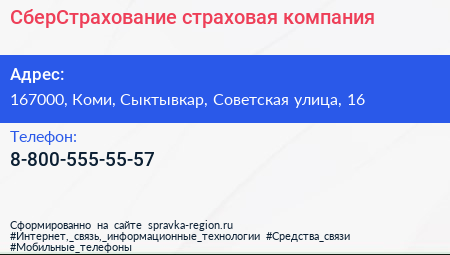 СберСтрахование, страховая компания по адресу 167000, Коми, Сыктывкар, Советская улица, 16 в дальнейшем Организация, размещена в следующих категориях: