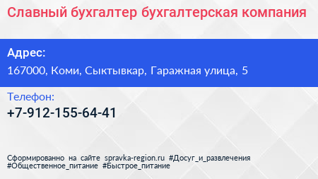 Славный бухгалтер, бухгалтерская компания по адресу 167000, Коми, Сыктывкар, Гаражная улица, 5 в дальнейшем Организация, размещена в следующих категориях: