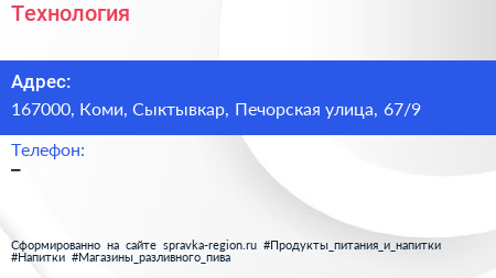 Технология по адресу 167000, Коми, Сыктывкар, Печорская улица, 67/9 в дальнейшем Организация, размещена в следующих категориях: