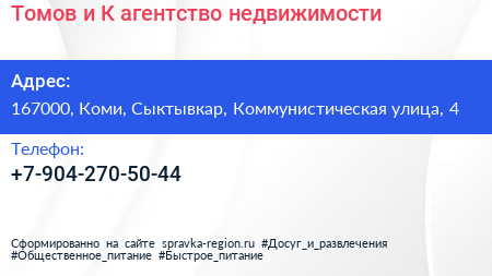 Томов и К, агентство недвижимости по адресу 167000, Коми, Сыктывкар, Коммунистическая улица, 4 в дальнейшем Организация, размещена в следующих категориях: