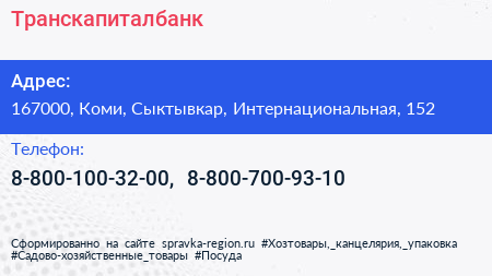 Транскапиталбанк по адресу 167000, Коми, Сыктывкар, Интернациональная, 152 в дальнейшем Организация, размещена в следующих категориях: