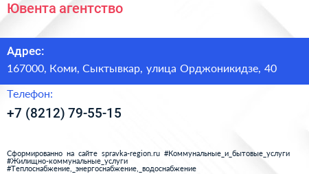Ювента, агентство по адресу 167000, Коми, Сыктывкар, улица Орджоникидзе, 40 в дальнейшем Организация, размещена в следующих категориях: