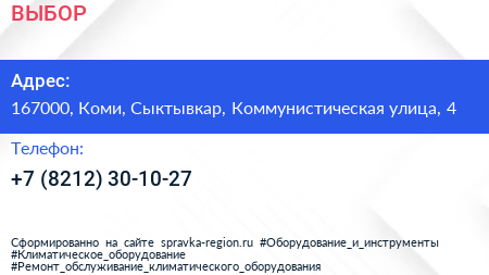 ВЫБОР по адресу 167000, Коми, Сыктывкар, Коммунистическая улица, 4 в дальнейшем Организация, размещена в следующих категориях: