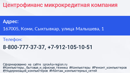 Центрофинанс, микрокредитная компания по адресу 167005, Коми, Сыктывкар, улица Малышева, 1 в дальнейшем Организация, размещена в следующих категориях: