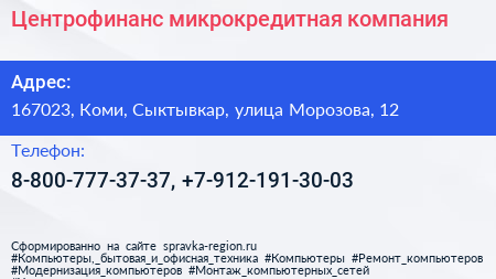 Центрофинанс, микрокредитная компания по адресу 167023, Коми, Сыктывкар, улица Морозова, 12 в дальнейшем Организация, размещена в следующих категориях: