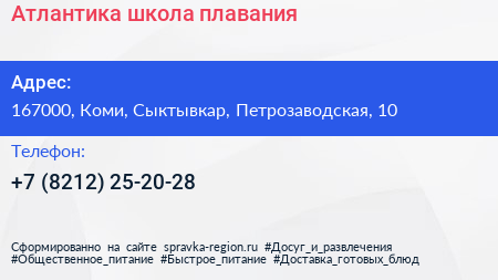 Атлантика, школа плавания по адресу 167000, Коми, Сыктывкар, Петрозаводская, 10 в дальнейшем Организация, размещена в следующих категориях: