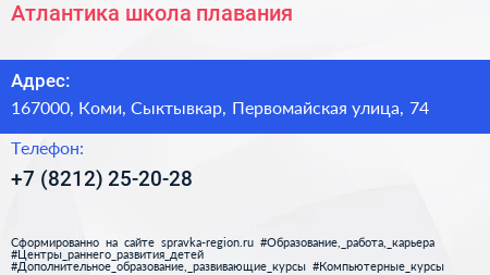 Атлантика, школа плавания по адресу 167000, Коми, Сыктывкар, Первомайская улица, 74 в дальнейшем Организация, размещена в следующих категориях:
