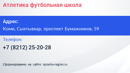 Атлетика, футбольная школа по адресу Коми, Сыктывкар, проспект Бумажников, 59 в дальнейшем Организация, размещена в следующих категориях: